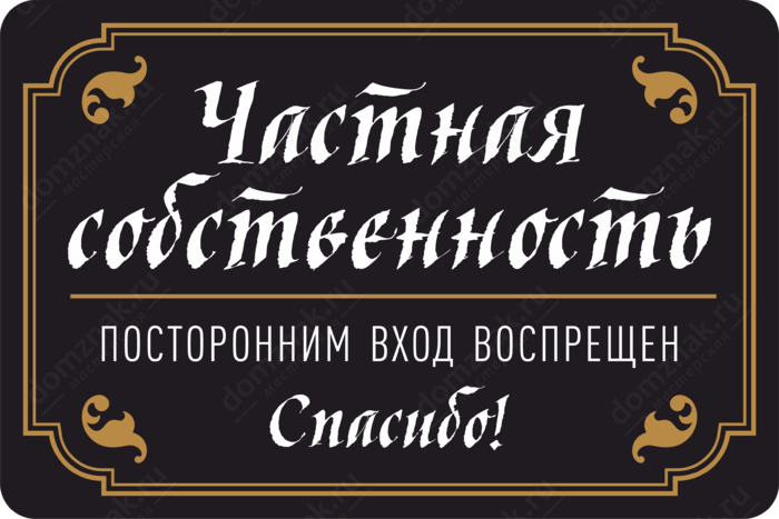 Оригинальная табличка, изготовленная в классическом стиле, эстетична и функциональна. Изящные золотые буквы на темном фоне, элегантный декор, корректный текст – сувенирная табличка украсит экстерьер дома и напомнит о необходимости соблюдать границы.